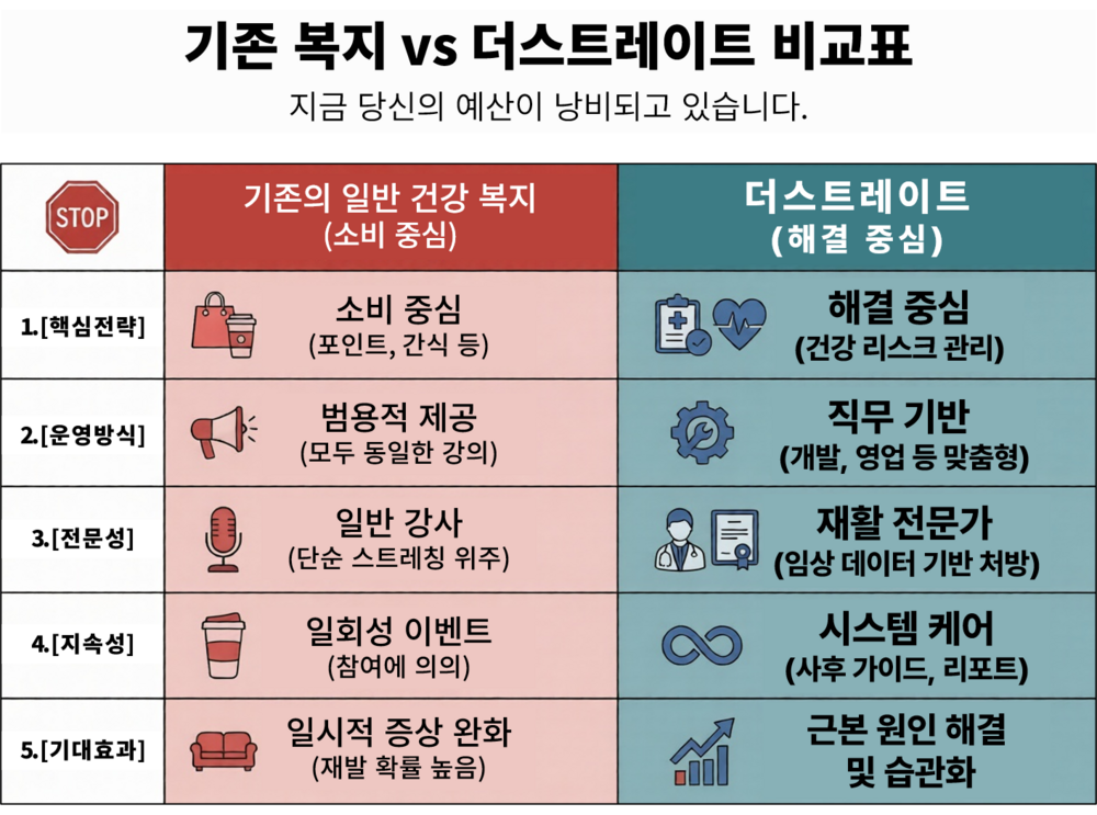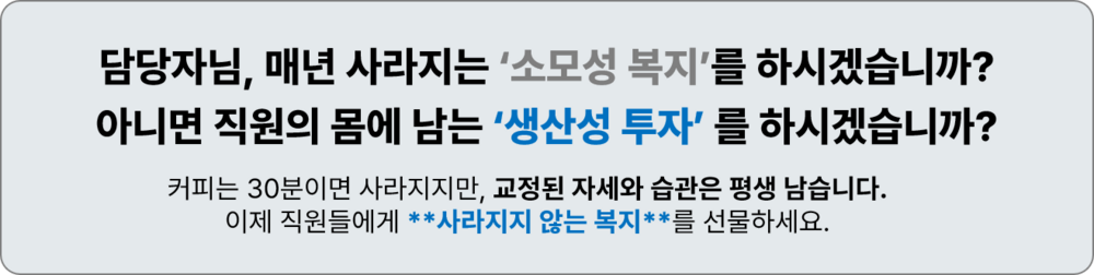 정작 직원들의 실제 문제는 목·어깨 통증, 허리 불편, 피로 누적, 스트레스처럼 ‘업무로 인해 쌓이는 건강 리스크’ 입니다.